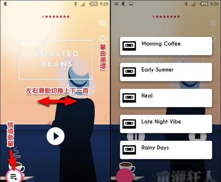 预设在「Morning Coffee」的歌单点击左下角可展开选择其它的情境。左右滑动可切换上下一首音乐预设会自动循环播放歌单中的 8 首音乐若对某一首音乐特别有感觉也可点击右上角的按钮开启单曲循环功能。