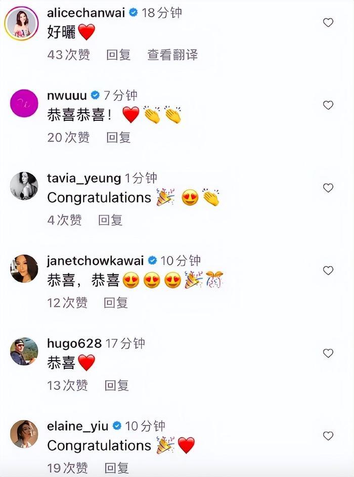 在两人宣布已经订婚之后,昔日的圈内好友陈炜、杨怡、胡定欣、黄子恒、姚子羚、周家蔚等人纷纷在底下评论送祝福,恭喜两人的爱情修成正果,甚至已经有不少人在催婚,等着喝喜酒了!