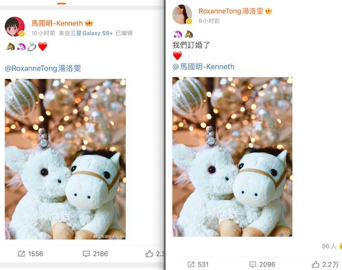 1月1日,马国明踩着点13点14分这个时间发布了独角兽亲吻小马玩偶的照片,并艾特了女友汤洛雯,值得一提的是,独角兽的角上放着一枚钻石戒指,马国明还配上了独角兽和小马以及戒指和爱心的表情包,以此来宣布自己向汤洛雯求婚成功的消息!