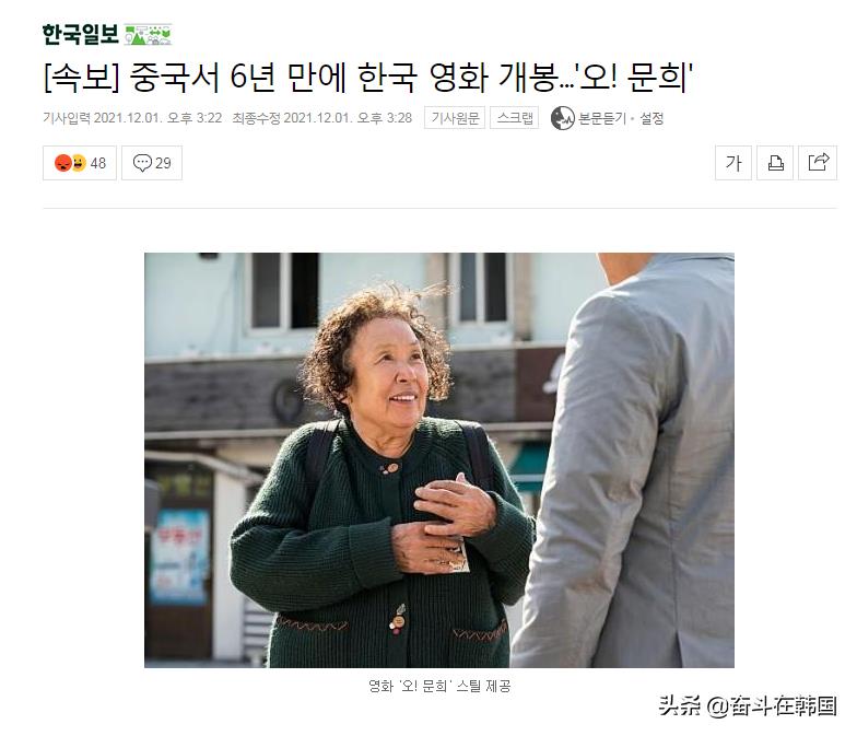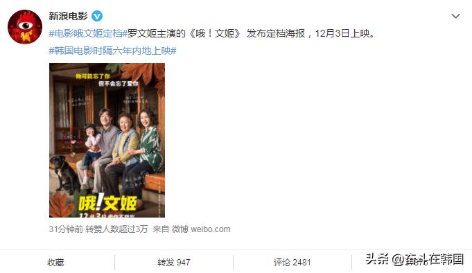 今日,韩国演员罗文姬主演的韩国电影《哦!文姬》 发布了定档海报,宣布将在12月3日于中国上映。这是时隔6年以来韩国电影再次在中国影院正式上映,上一次被中国引进公映的韩国电影还是2015年9月由全智贤和李政宰主演的《暗杀》。
