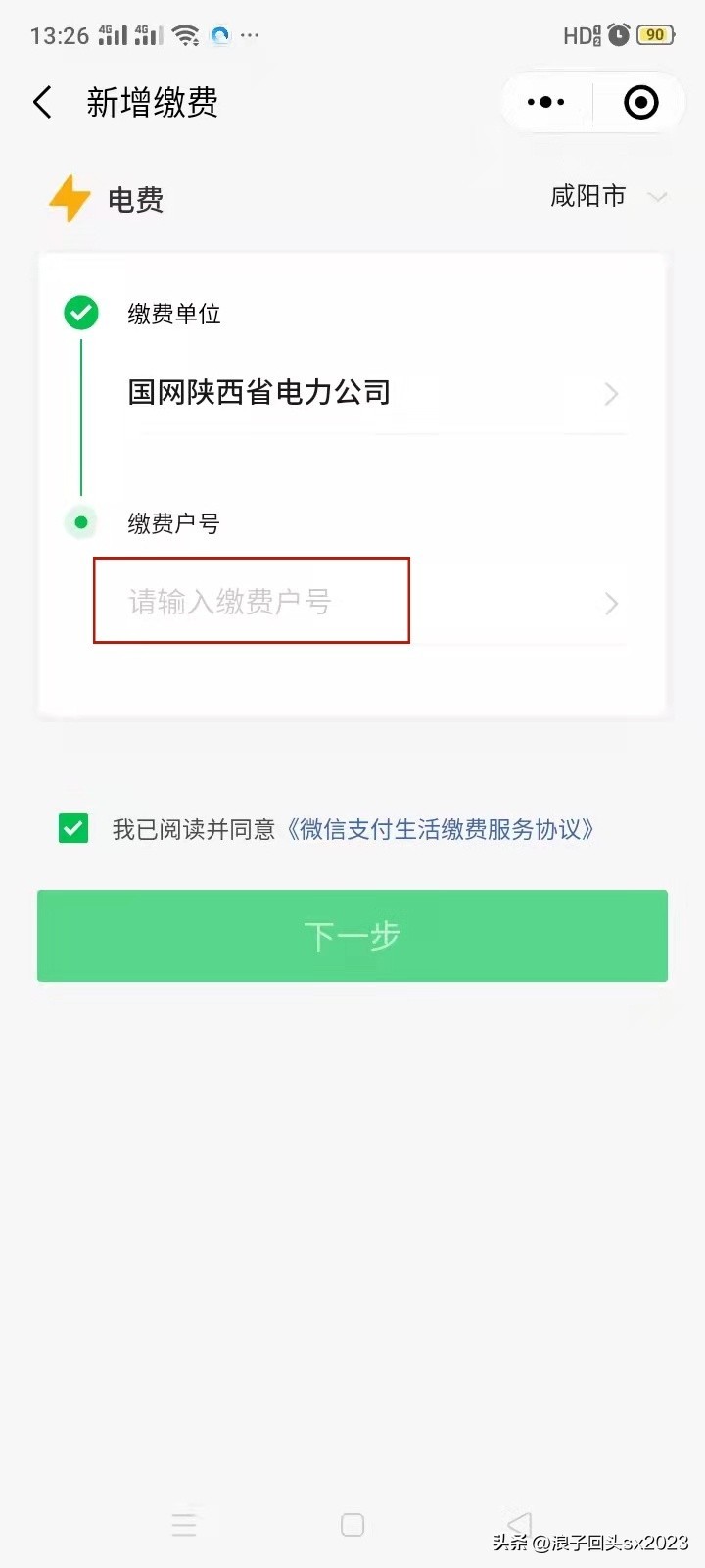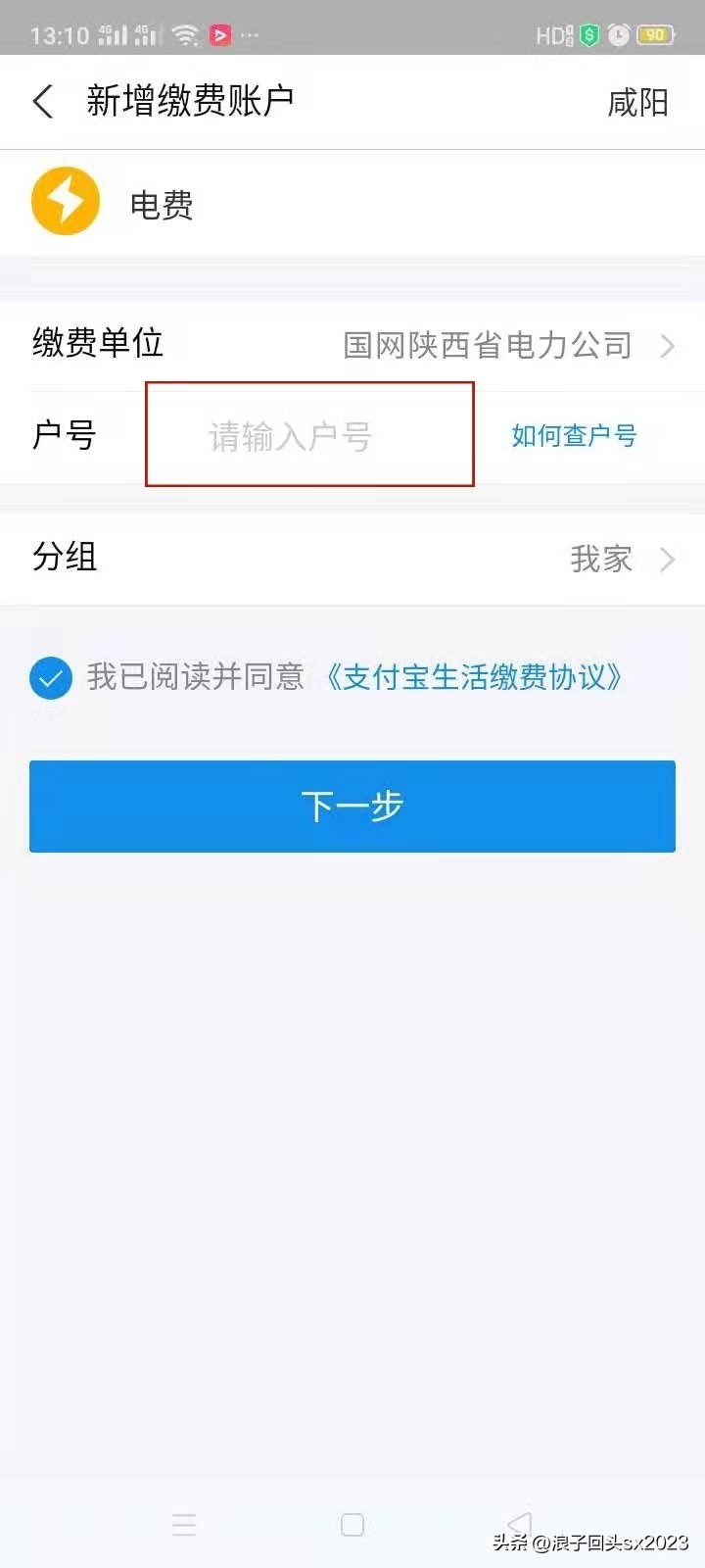 5、新增缴费账户:输入户号,点下一步,确认户名,输入金额,完成缴费。