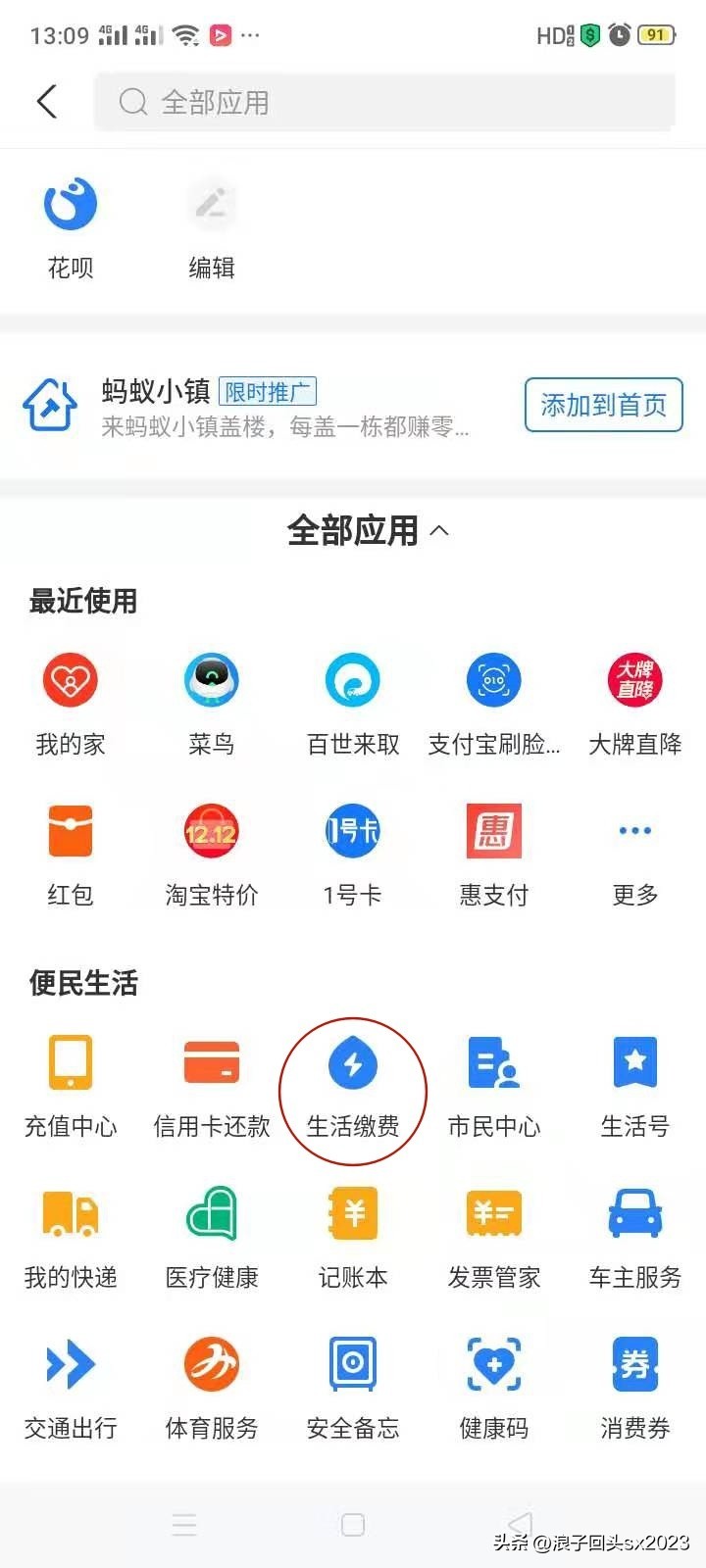 2、全部应用-便民生活-生活缴费;