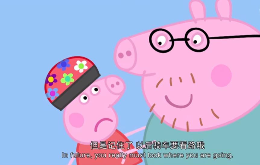 Peppa尝试着骑只有两个轮子的自行车,但是一上去就摇摇晃晃的,很快就从车上摔了下来。爸爸问Would you like some help, Peppa?Peppa, 你需要帮忙吗?Peppa说Yes Please, Daddy。是的,我需要,爸爸。