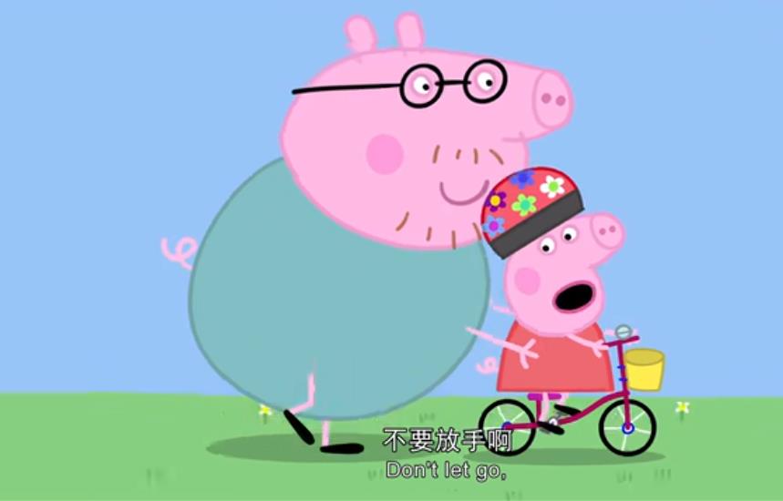 Peppa骑在自行车上面,Daddy Pig扶着她,Peppa紧张的说Don’t let go, Daddy!爸爸,不要放手啊。后来又说了一句Hold on, Daddy! 紧紧抓住啊,爸爸。