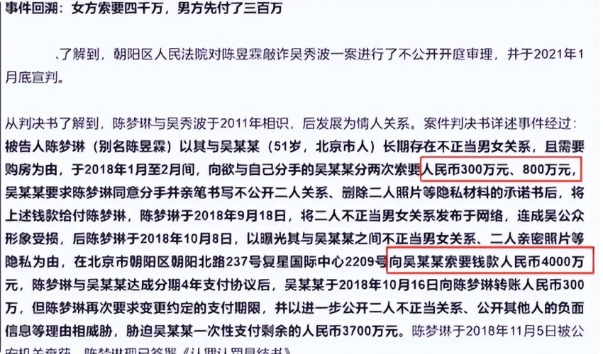 在经过一段时间的平静后,陈昱霖向吴秀波索要4000万元的分手费,以此弥补自己失去的青春。