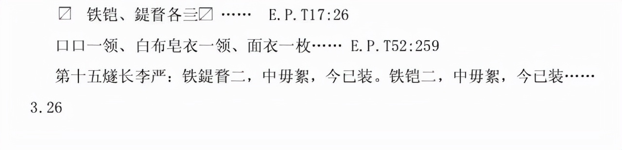 作为军人,戍卒们自然有国家给的军服衣物,军服主要是铠甲,头盔等防护用具,例如居延汉简有"白玄甲十三领,革甲六百五十,铁铠二千七百一十三"这应是对某个候部铠甲的统计,具体到个人的衣甲,同样有记录
