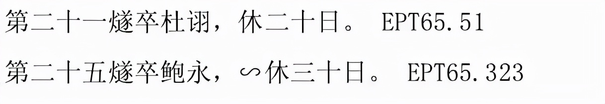 汉代戍卒们是有假期的,假期分为正常休假和病假,汉简多处提到"更休""当休",一般外出劳作的戍卒数日可以休息一日,同时在汉代节假日已经有不少,像比较重要的节日,如腊节不但会放假,还会给戍卒发放一小笔过节费。在汉简中有专门休名簿来登记戍卒们的休假,如果是请长时间的病假则需要先向隧长打报告,然后隧长会上报给候长,最后由候官批示,在病假结束后需要去销假。除此之外,还有事假、丧假。