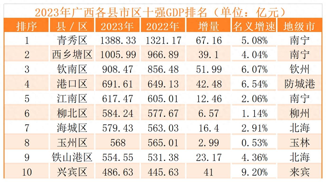 说到经济强区,怎么能不提咱们的青秀区呢?它以1388.33亿的GDP总量,稳坐头把交椅,同比增长了5.08%。这个数字背后,是无数辛勤工作的身影,是首府南宁作为广西心脏地带的强劲脉动。