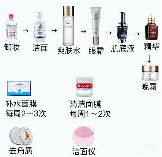 其中,肌底液和精华液依然是按照自己的护肤习惯,可以二选一做删减,敷面膜可以按照自己的需求增加或减少,油皮可以适当去角质,干皮、敏感皮没有必要去角质,只需要做好日常皮肤的清洁就可以了。
