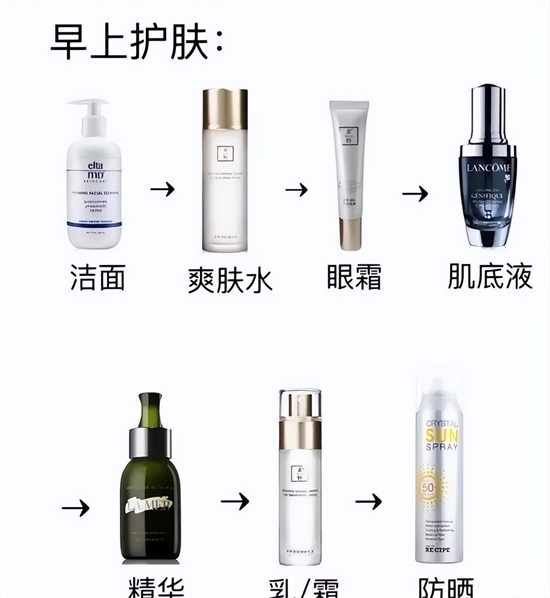 如上图所示,这是一个完整的护肤步骤,大家可以根据自己的需求做删减,但是要记住防晒霜用在护肤的最后一步,化妆的最后一步,可以起到更优秀的防晒力,还能保护皮肤不受损伤。