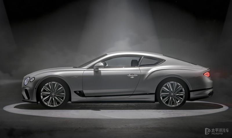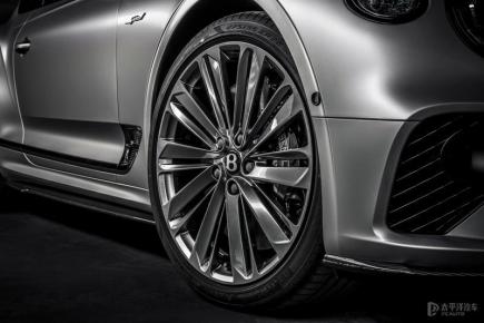 车身侧面,新车前后突出的翼子板搭配22英寸熏黑密条辐轮圈,无时不刻都彰显出极致的性能。此外,新车在前翼子板侧面还标注了“Speed”字样,并镶嵌了“12”的标志,以证明这不是一辆普通的了欧陆GT。