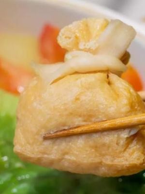 嫩黄的豆腐皮,包裹着鱼肉做的鱼糜、鱼籽,再用笋节打结,做成福袋的形状,外表十分Q萌。