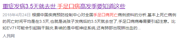 而根据中国疾病预防控制中心对全国手足口病死亡病例资料的分析,死亡病例的死亡时间平均是在3.5天。