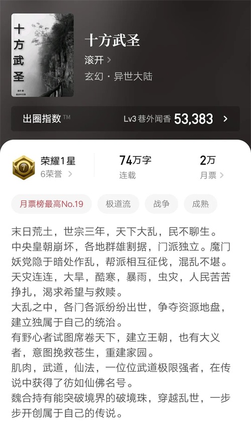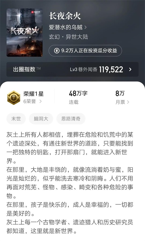 在已发布的小说中,爱潜水的乌贼写过东方玄幻,西方玄幻,仙侠,武道等题材,而这次则是废土流,作者不断挑战新领域,每一本小说都是一段全新的旅程。