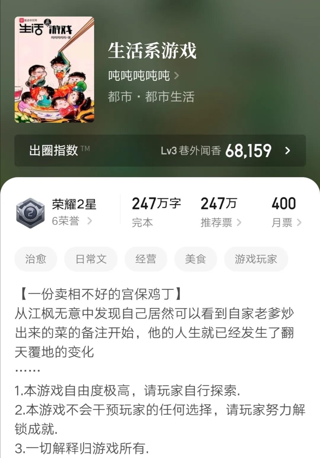 从江枫无意中发现自己居然可以看到自家老爹炒出来的菜的备注开始,他的人生就已经发生了翻天覆地的变化。回归本质看了会饿的美食文,色香味俱全!生活系如其名,由江家的日常展开,轻松活泼,偶尔会触发过往的回忆,看得到画面,闻得到味道,五味杂陈,回味无穷,是一株美味的仙草。