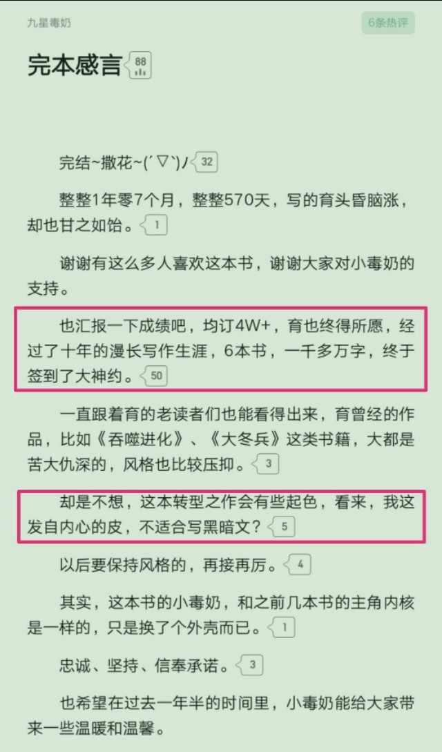 5月21日,作者“育”发布完结感言,他的大热作品《九星毒奶》正式完结!
