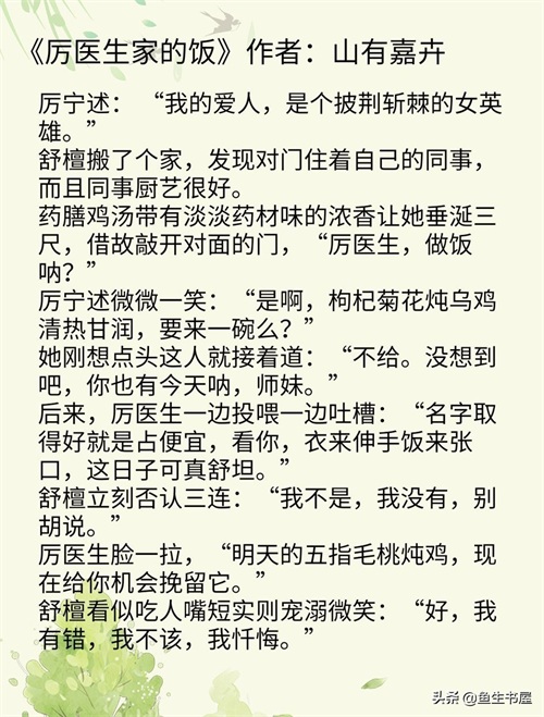 主人公性格讨喜,没有什么狗血奇葩的事件,纯甜不俗套,不狗血,给人一种岁月静好的感觉,看完意犹未尽,想吃厉先生的饭
