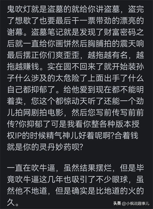 盗墓笔记因为没有完结,所以粉丝能有一些参与感,鬼吹灯逻辑太严密了没给我一丝插入的空间,我好像只是一个观众