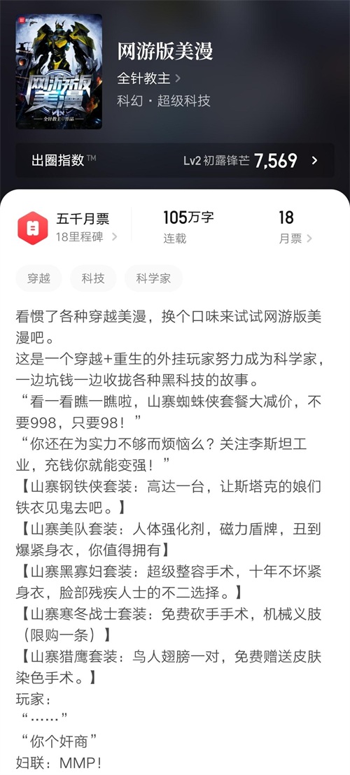2、作者塑造的主角是一个科学家加奸商的形象,开局上来就是创造变形金刚。脑洞很大,因为是网游,所以各种骚操作层出不穷。