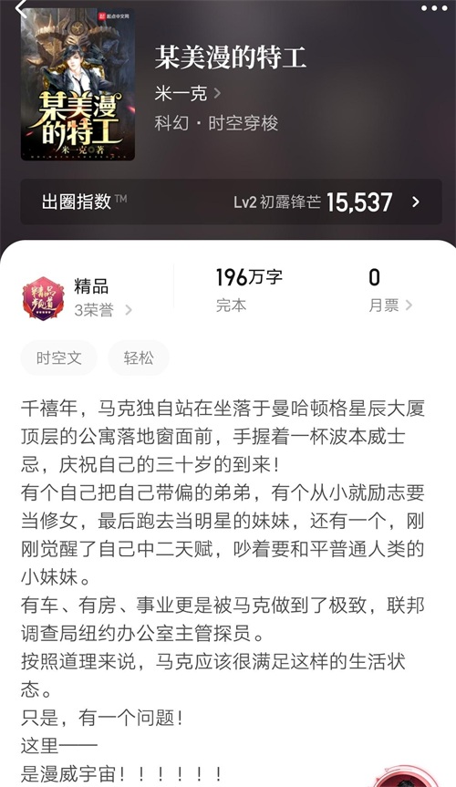 1、本书又名我的前女友们,主角穿越美漫世界,成为FBI的一名特工,结果满世界都是主角的前女友。本书日常系,主角身份特殊,随时随地怼神盾局。