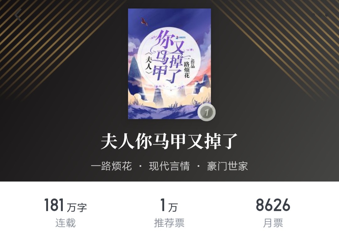 今天的八丈河推书推荐现代言情小说,起点十本近期最火的现言小说,也是起点女生月票风云榜前十作品。其中网文界女频知名大神【叶非夜】【战七少】【囧囧有妖】【沧澜止戈】【锦凰】都有新书上榜,但最令人惊喜的却是新晋大神一路烦花的最佳新作《夫人你马甲又掉了》,强烈推荐!