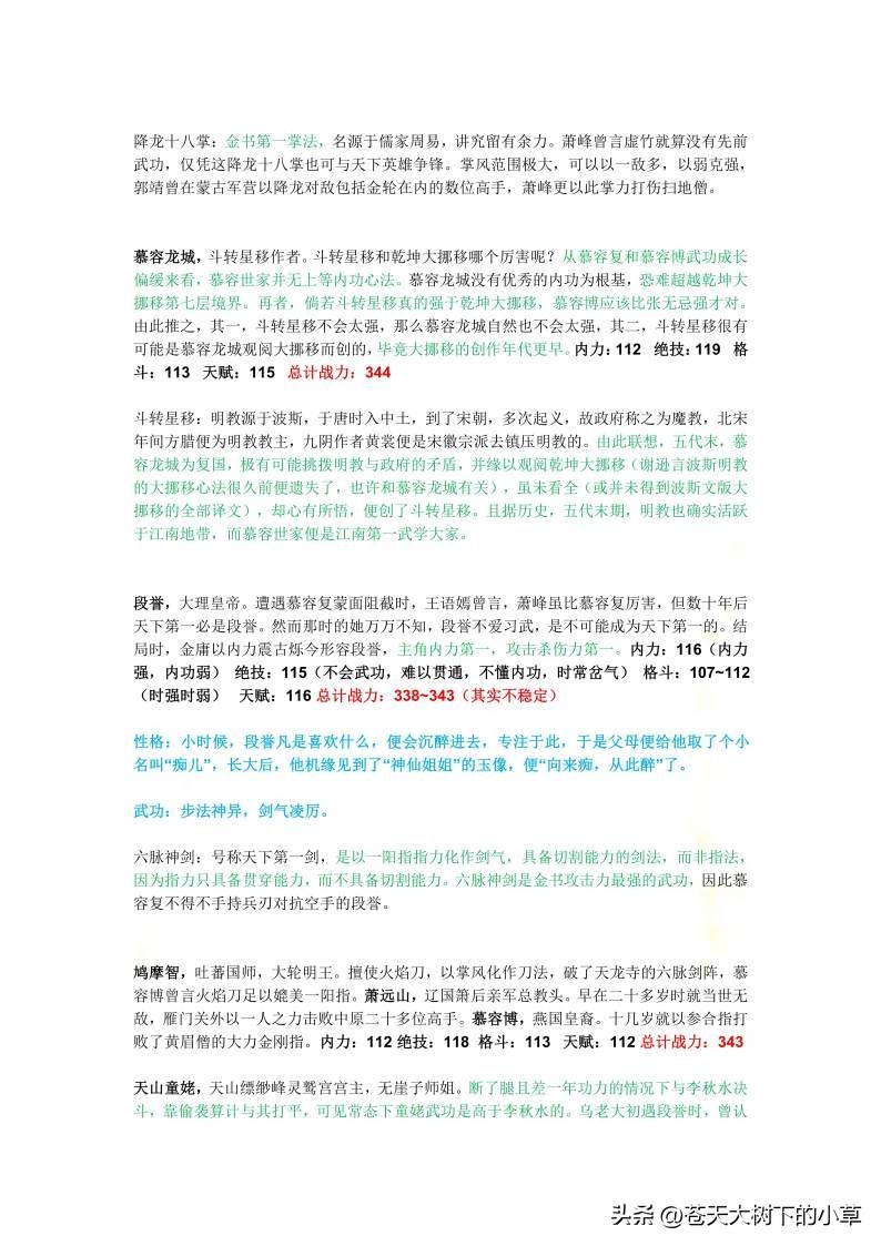 我将武功构成大致分为:内力(包含内力以及内功),格斗(包含外功,实战经验与技巧,以及兵器的运用),绝技(包含绝技强度,精通程度,以及全面性),天赋(单指个人资质,即智能和体能,不包含武功增益所带来的成长),总计战力(内力,绝技,格斗三项综合,与天赋无关),论据基本来源于金庸一百问和新修版小说原文。
