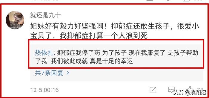 热依扎还透露,哺乳期现在已经过了半年了,因为热依扎曾自曝自己是重度抑郁和重度焦虑的患者,所以她说自己为了孩子停了抑郁症的药,现在因为孩子她已经康复了!