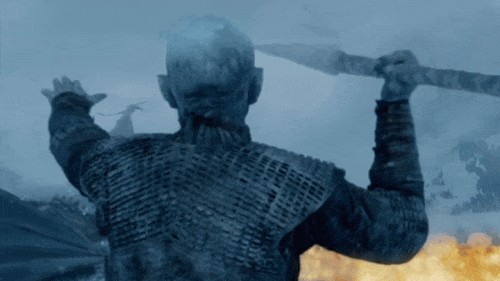 夜王骑着尸化的韦赛里昂,蓝色龙焰融化冰封的城墙。