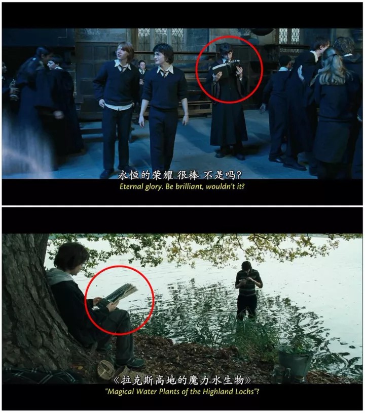 在《哈利波特》4中,当大家都在围观火焰杯的时候,只有纳维一个人在看书,这本书的名字是《Magic Water Plants of the Highland Lochs》。