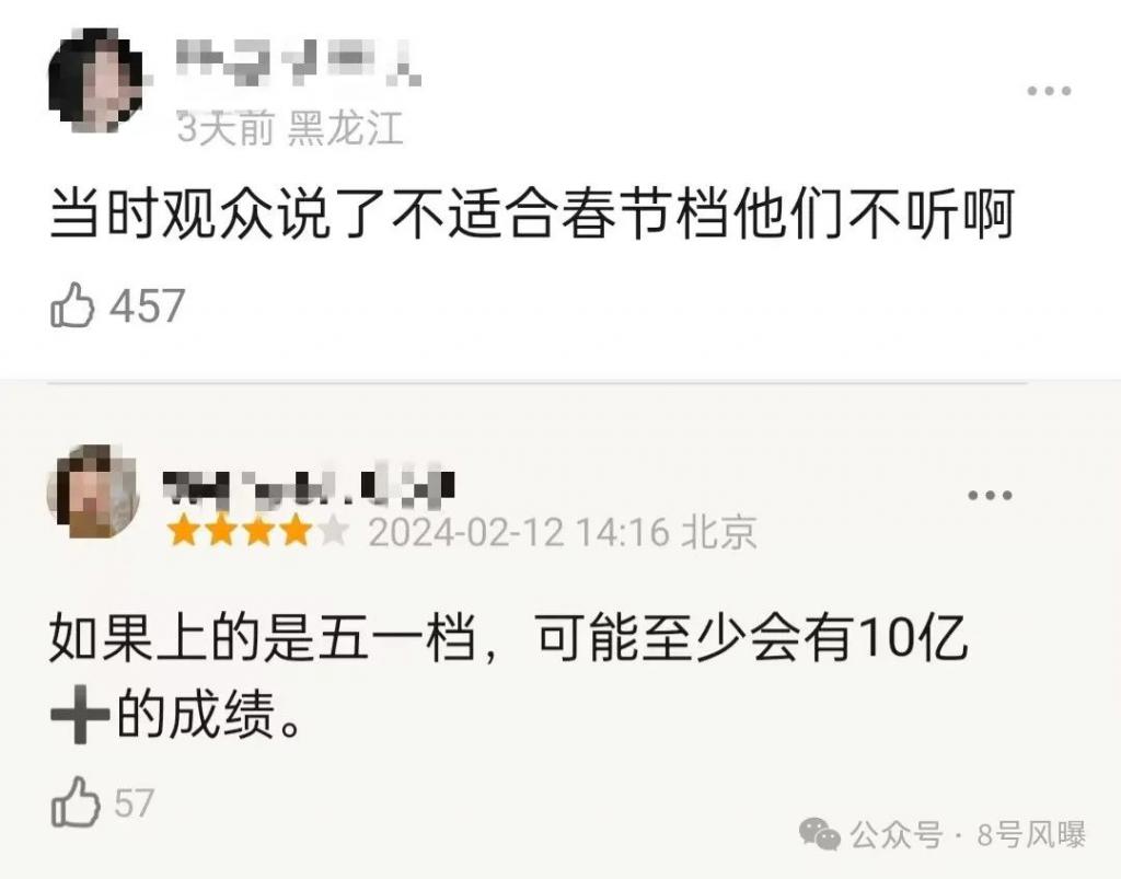 这次事件也给所有电影人敲响了警钟,春节档不是万能的,一部真正优秀的电影即使不在热门档期也不会沦为沧海遗珠。与其为了在热门档期中分一杯羹得不偿失,不如根据电影的题材选择更加合适的档期,说不定能成为一匹黑马。