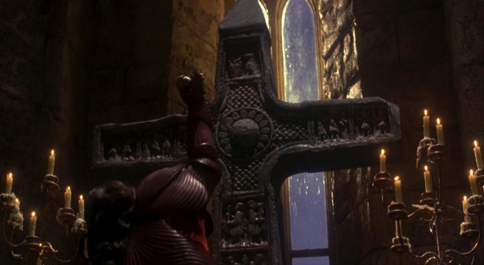 目睹爱人的离去,德古拉悲痛万分。而此时教会却说根据基督教教义,投河自尽的王妃的灵魂无法升入天堂;教会的说辞激怒了德古拉;自己忠心耿耿的为上帝和教会效力,却得到如此下场,于是他迁怒与教会和上帝,大闹教堂,将利剑刺入基督神像,并发誓饮血为生,忠于魔鬼,用尽邪恶的力量复仇。仇恨愤怒让德古拉投身魔鬼,变成了一名吸血鬼。
