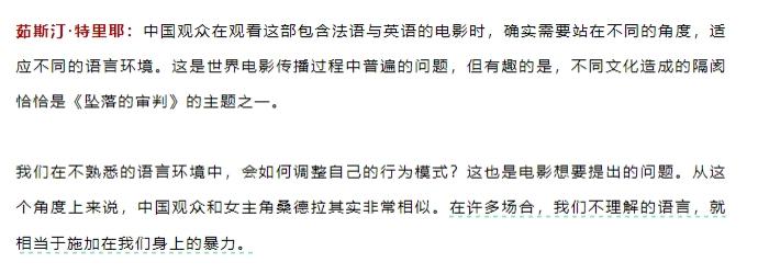 但《坠审》中的桑德拉,体验到的则是语言的另一个真理,也即电影导演茹斯汀 · 特里耶在采访中所说的: