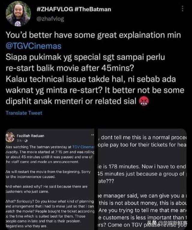事后,不少同场的影迷忍不住在脸书、推特发文抨击了电影院的行为,并且要求曝光这位VIP客人的身份。“如果是因为技术问题、设备故障重播,这没关系,但因为有人迟到而重播是什么意思?到底是为了哪家望族的孩子或亲戚?别告诉我这是正常程序,大家都是看时间买票来看电影的,为什么要因为他的迟到而多花45分钟?”一位愤怒的影迷如此说道。