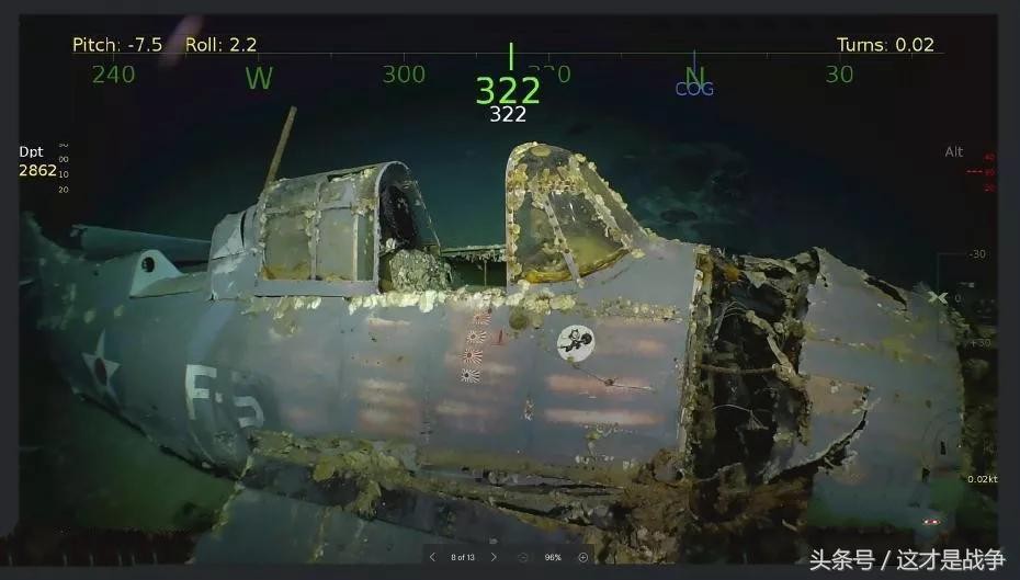 搜索者发布的图像显示,残骸完整无缺,包括5英寸口径的高射炮,炮弹还在炮管里,在几个地方都能看到这艘船的名字,一架完整的F4F野猫式战斗机上美军机徽,VF2中队徽还清晰可辩。