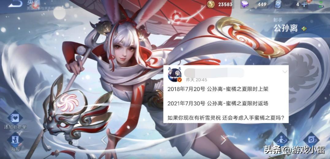 但是祈雪灵祝这款皮肤再怎么说也是牛年限定的,所以还是有许多玩家进行购买的,尤其是一部分没能获得蜜橘之夏的玩家们。可是谁曾想啊?现如今蜜橘之夏又返场了,这让那部分已经购买了祈雪灵祝的玩家们后悔莫及。所以就有小伙伴们问小雷哥啊:已经购买了公孙离祈雪灵祝的玩家们有必要再购买蜜橘之夏么?今天就让小雷哥来给小伙伴们说道说道。