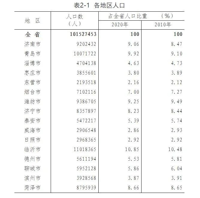 山东全省常住人口为10152.7万人。从地区人口看,16个地级市中,人口超过1000万人的市有2个,分别是临沂市1101.8万人、青岛市1007.2万人,其中青岛市常住人口首次突破1000万。有2个市在1000万人至900万人之间,分别是潍坊市938.7万人、济南市920.2万人。