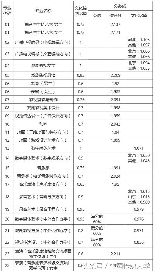(四)学校以文化折算比值和专业折算比值为依据进行录取。其中,文化折算比值=考生文化考试成绩÷生源省份普通类本科第一批次录取控制分数线(以下简称一本线);专业折算比值=考生参加学校组织的专业考试总分÷该专业合格分数线。对于合并本科批次的省份,一本线以各省相关规定为准。对于艺术类考生文化考试总分与普通类考生文化考试总分不一致的省份,一本线以该省给定的参考分数线为准,未给定参考分数线的省份,参考分数线=(一本线÷普通类考生文化考试总分)×艺术类考生文化考试总分。上海、浙江一本线参照教育部及省级文件规定执行。