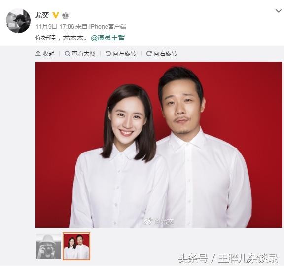 而王智老公尤先生尤奕也很快在微博上晒出了幸福。一句简单的“你好哇,尤太太。”完美的向即将过节的网友们洒出了一大把狗粮。