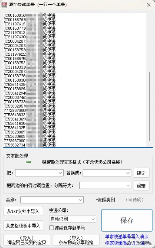 4.返回主界面,点击“添加单号”功能,将需要查询的快递单号复制粘贴或从TXT文档中批量导入,确保每个单号占一行,单击保存,即可自动查询