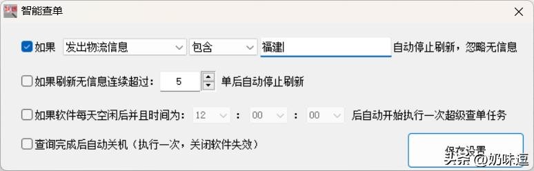 2.在智能查单设置中,根据需要选择停止刷新的条件(如物流信息包含特定地区或无信息单号连续超过设定数量)
