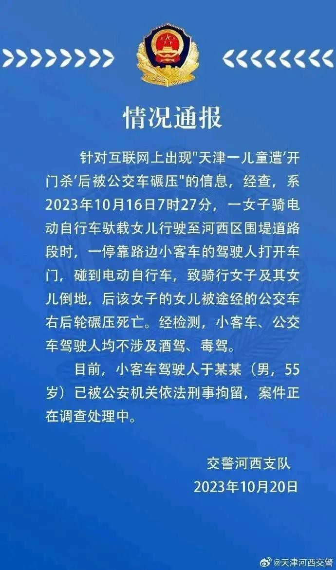 天津河西交警于10月20日发布了一份情况通报,澄清了关于一名儿童在天津遭受交通事故的信息。经过调查,事故发生在2023年10月16日早上7时27分,一名女子骑电动自行车携带着她的女儿行驶在河西区围堤道路段时,一辆停靠在路边的小客车的驾驶员打开车门,不慎碰到了电动自行车,导致骑车的女子和她的女儿摔倒在地,而后经过的一辆公交车不幸碾压了女儿,造成女儿不幸身亡。经过酒驾和毒驾检测,小客车和公交车的驾驶员均没有涉及酒驾或毒驾。