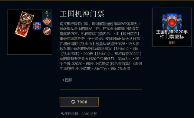不过司机哥还是建议大家可以购买门票来参加钛金币的收集,一个门票基本上就可以完成2000枚钛金币的收集,刚好可以兑换到一个王国机神至臻皮肤。除此之外买门票还有很多额外的奖励,比如说有多送200枚钛金币、还有4个钛金法球,这个法球是可以抽取到皮肤碎片,运气好可以抽中福袋,抽到一些限定皮肤,当然就要看你的人品了。还有25点至臻点以及一个小小英雄蛋和8颗海克斯宝石,还是非常划算的!不知道你们准备好入手这个王国机神至臻盖伦吗!