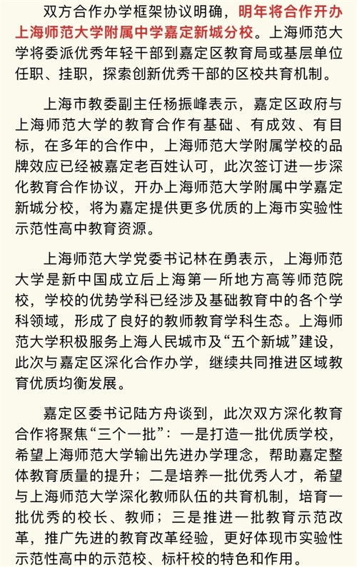 12月19日,《上海市嘉定区人民政府、上海师范大学进一步深化教育合作的框架协议》《上海市嘉定区教育局、上海师范大学合作举办上海师范大学附属中学嘉定新城分校的协议》签订,嘉定将新增一所市实验性示范性高中。