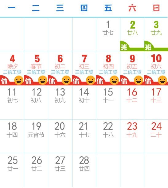 二、春节:2月4日至10日放假调休,共7天。2月2日(星期六)、2月3日(星期日)上班。