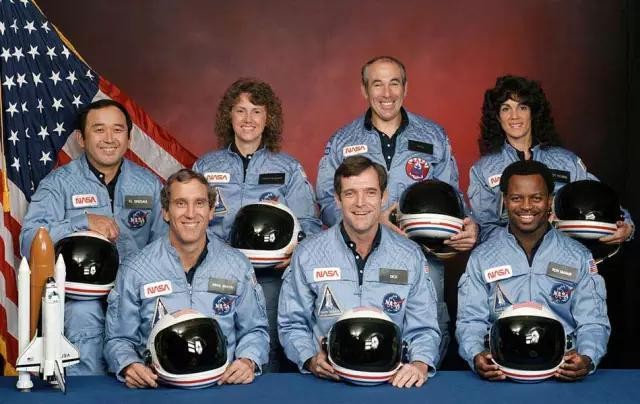前排:Michael J. Smith(驾驶员),Dick Scobee(指令长),Ronald McNair(任务专家),后排:Ellison Onizuka(任务专家),Christa McAuliffe(女教师),Gregory Jarvis(载荷专家),Judith Resnik(任务专家)