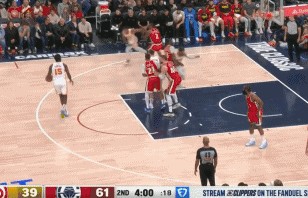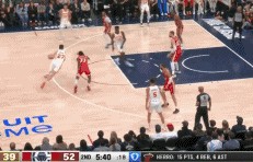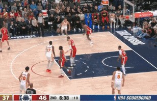 老鹰守转攻,亨特有机会拖车跟进上篮,莱昂纳德右手一切干扰,造成他上篮未果,反击战接哈登传球轰进三分。