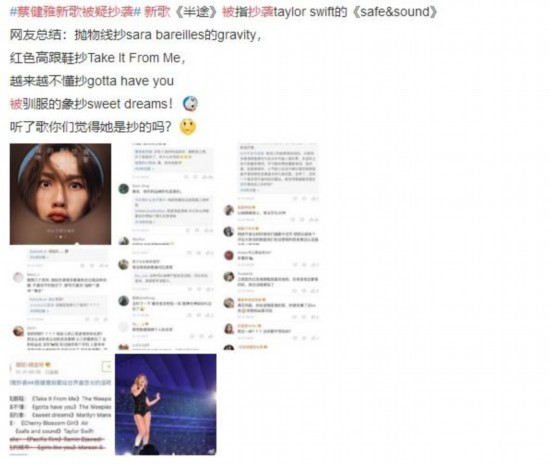 21日,蔡健雅新歌被疑抄袭泰勒·斯威夫特。她在微博发长文回应此事,称:“我能保证的是,‘抄袭’我不敢,不认同,也不需要。”“我只能靠着当下的灵感,写对得起自己也对得起歌迷的音乐。”并自侃自己是“中年老女人”,没法翻全世界的歌对比。粉丝表示霉霉今年签约环球音乐,合同中有一条条款是要求环球出售的Spotify股份必须给环球旗下艺人分成,且不得扣除。