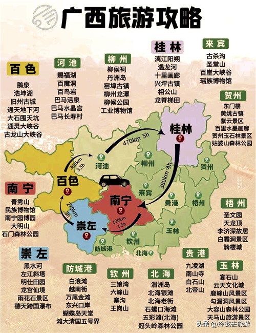 广西---游玩天数:5~7天,山水闻名于世的桂林,山和水都很美,还有又臭又香的螺蛳粉。记得去北海吃海鲜。