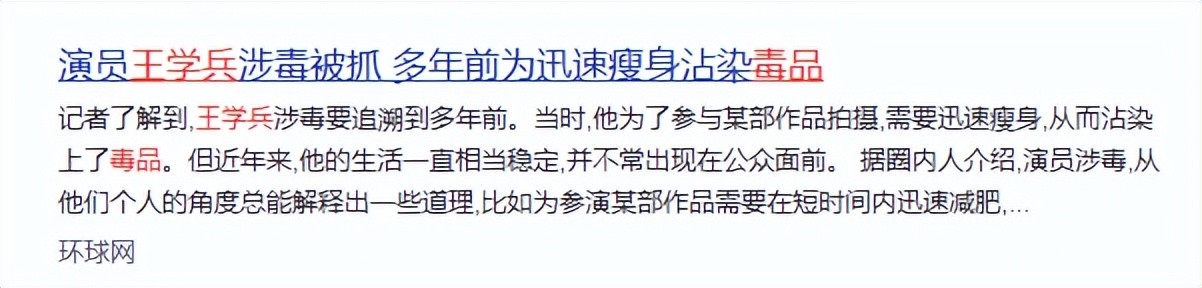 资料参考:2015-03-10环球网——演员王学兵涉毒被抓 多年前为迅速瘦身沾染毒品