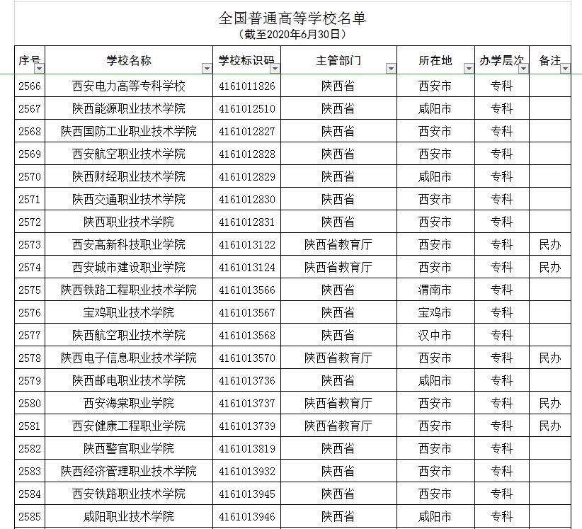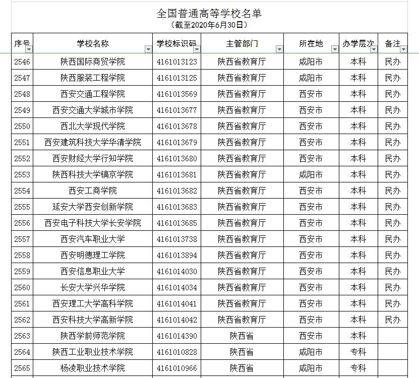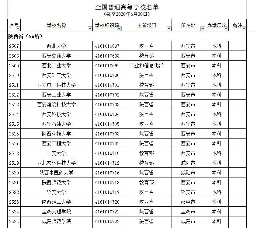至2020年6月30日,教育部公布的2740所全国普通高等学校中,陕西省有96所: